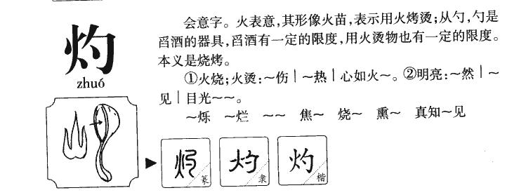 烧字拼音是zhuó,康熙字典笔画为7幅,部首为火,表示烧、烧;理解透彻;清晰等意义。