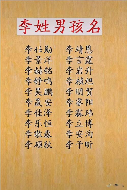 2017年,李姓宝宝的名字大多受到传统文化的影响,往往具有好消息、祝福、崇高和自然的特点。以下是2017年流行的李宝宝男孩的名字: