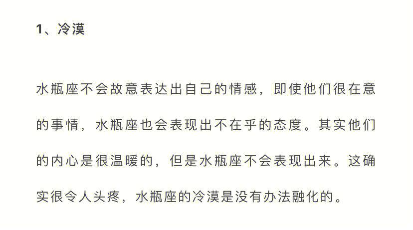 1.冷淡解决水瓶座假如生气的话,她们是直接不理人,立即忽略另一方,当对方不会有,二水瓶座的爱人知道自己被冷落就会感觉哪儿自己做错了,水瓶座想要的就是他们的理性思考,这样不但会使水瓶座觉得自己是一个非常聪明的人,能让对方积极思考,也可以觉察出他是不是在意它的这类情意,所以遇到另一方犯错误时,水瓶座有意气人表现形式无非就是立即冷淡看待。