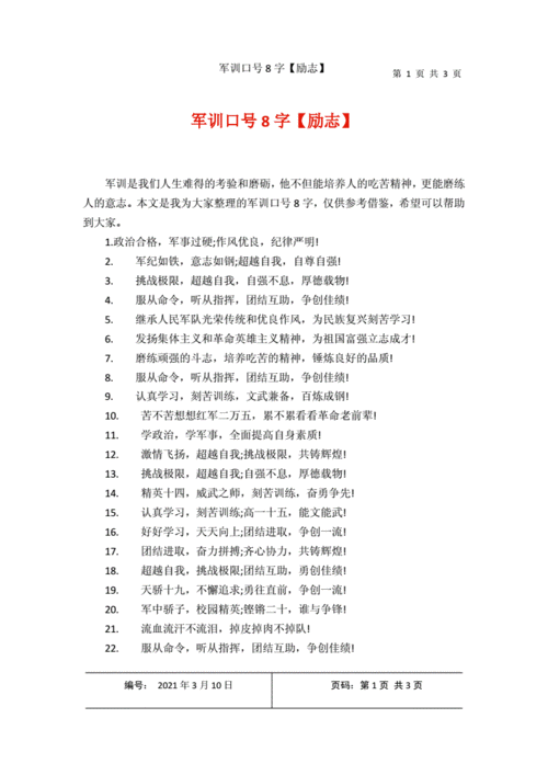 八字口号是军人的一句经典口号,旨在在战场上解决问题的方法。它代表了军人的信仰和韧性,是他们在困难时刻的精神支柱。现在,很多人也在生活中采用这些口号来激发他们的内心力量并面对挑战。以下是几个典型的八字口号:
