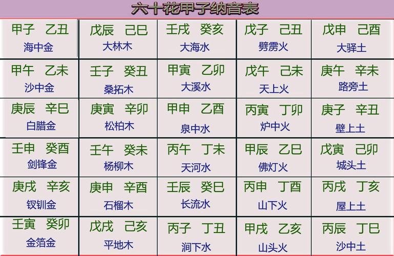 了解甲子纳音表需要掌握一些基本知识。首先,我们应该知道甲子纳音表由12个地支和5个天干组成。每个地支代表一种动物,每个天干代表一种元素。例如,“子”是地支中的个,代表老鼠,而天干中的个是“甲”和木头。