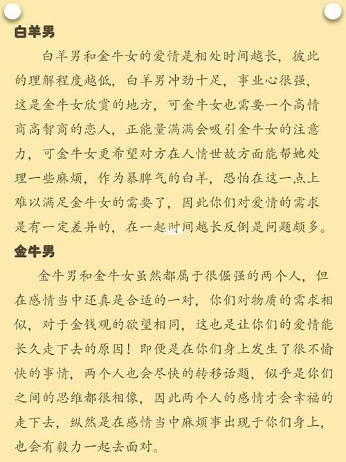 2.摩羯座女人:摩羯座女人和金牛座男人一样,注重现实和现实。他们会互相鼓励和支持,共同创造更好的生活。