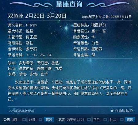 1996年双鱼座日期:1996年2月19日05:01pm-1996年03月20日04:03pm