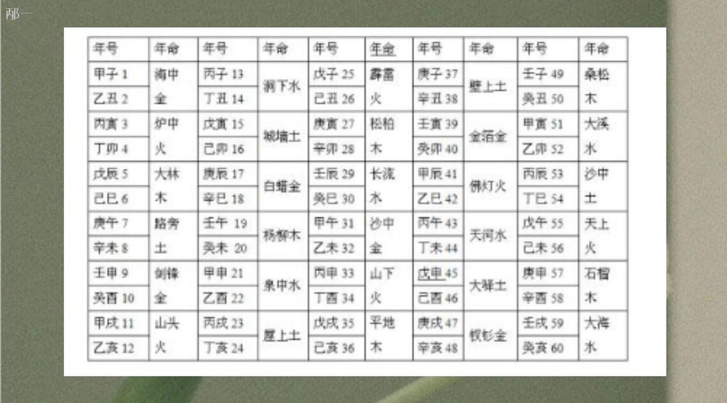 以下是纳音五行的公式(根据自己出生年份的干支查表):