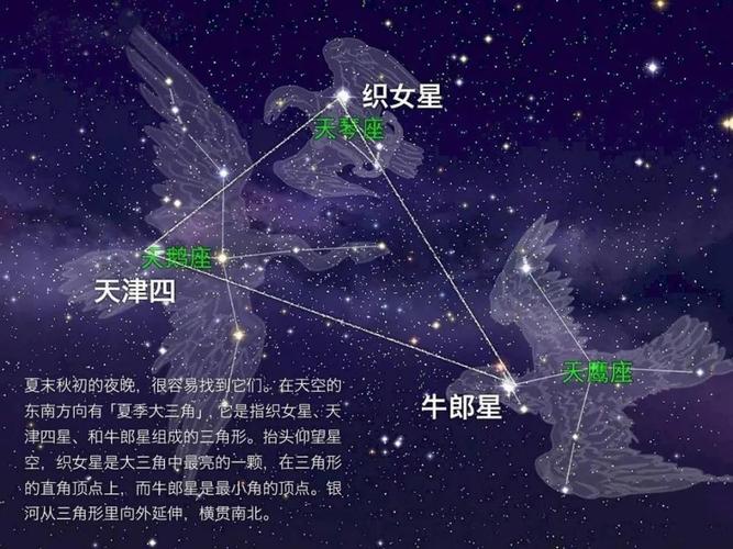 牛郎星:属于天鹰座;学名河鼓二,又称“牵牛星”,是全天排名第十二的明星,白色。在星空观测中,它是夏天大三角的一个角落。它和天鹰座β、γ这颗星的连线指向织女星,西方称这颗星为Altair,是阿拉伯语的“飞鹰”。