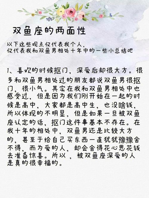 喝酒后,双鱼男说想我 喝酒后,双鱼男说想我的表现是什么1、会用甜言蜜语哄你:对于喜欢你的女生来说,总会在一些浪漫的场合表现出来。例如,在吃饭时,你也会为对方准备一束花或一条性感的小裙子,让男孩愿意给她;或者当你看到他快乐时,你会主动聊天,甚至故意和自己聊天,让你知道他爱你。2、会很真诚:虽然有些人对感情不是特别专一,但如果遇到喜欢你的人,可以坦诚地说出自己的心里话。但如果你发现两个人在恋爱中都很真诚,你会直接坦白,告诉他对方内心的想法。3、经常做梦:如果你在睡觉前做梦,这意味着你们的关系在这段时间内开始稳定,所以你需要抓住这个机会。4、知道如何关心别人:双鱼座是一个非常善良的星座,无论他们做什么,他们都是一种温柔。而且他们也很善于关心身边的人,尤其是身边的朋友。如果有人想问他为什么这么做,他们会毫不犹豫地同意。5、会觉得你是他唯一的人:因为他们总是认识一个人。对他们来说,最清楚的事情之一就是他们应该做些什么来互相帮助。因此,当他们和朋友在一起时,他们会觉得自己非常值得信赖,因为他们知道如何获得幸福。