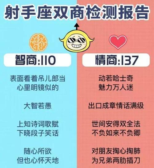 射手座射手座人爱好自由,具有较高的灵性、创造力和探索精神,智商方面相对较高。由于个性张扬而不喜欢受约束,因此情商方面相对较弱,有时会显得不够稳重。